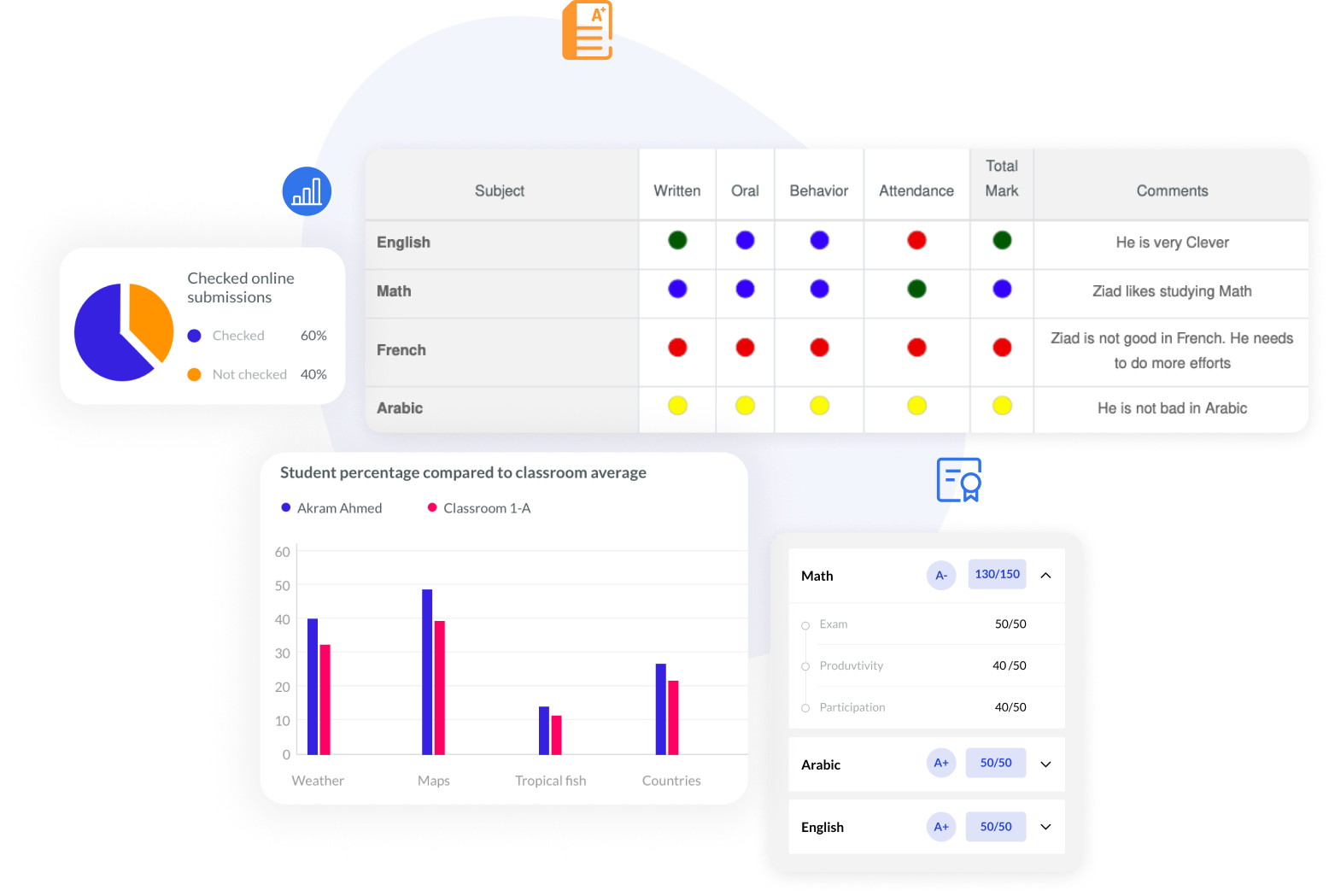 Auto-generated, curriculum-aligned report cards tailored to each school’s grading system and academic standards.